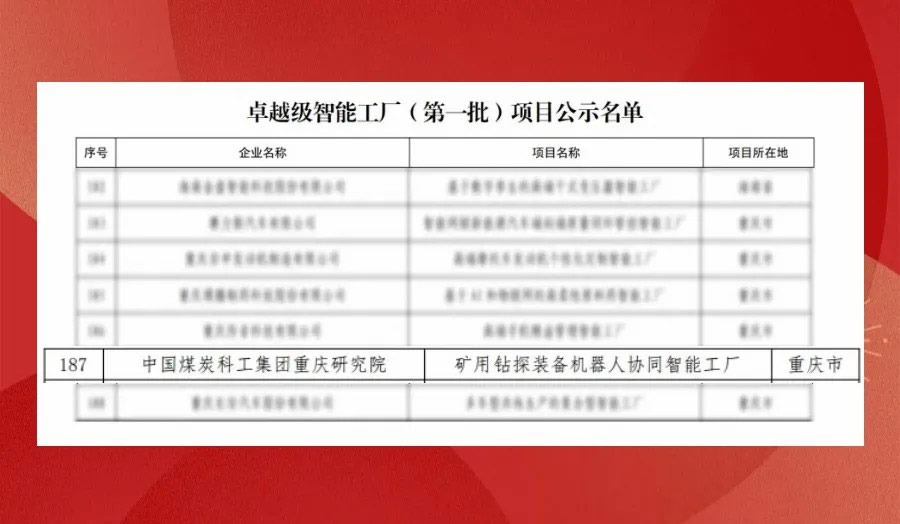 近日,工業(yè)和信息化部發(fā)布了《關(guān)于卓越級智能工廠(第一批)項目的公示》。重慶研究院的“礦用鉆探裝備機器人協(xié)同智能工廠”成功入選。