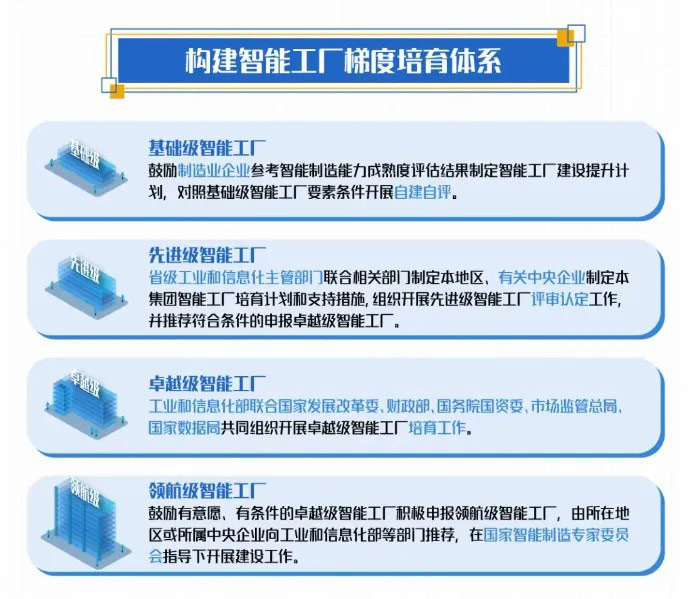 【鏈接:智能工廠梯度培育體系】2024年,工業(yè)和信息化部、國家發(fā)展改革委、財政部、國務(wù)院國資委、市場監(jiān)管總局、國家數(shù)據(jù)局等六部門聯(lián)合印發(fā)通知,部署開展2024年度智能工廠梯度培育行動。明確將構(gòu)建智能工廠梯度培育體系,按照《智能工廠梯度培育行動實施方案》《智能工廠梯度培育要素條件》,分基礎(chǔ)級、先進級、卓越級和領(lǐng)航級四個層級開展智能工廠梯度培育。