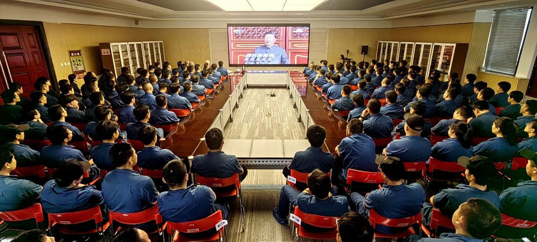上圖:巨能股份員工集中觀看閱兵式藍(lán)杰鈑金分會(huì)場(chǎng)