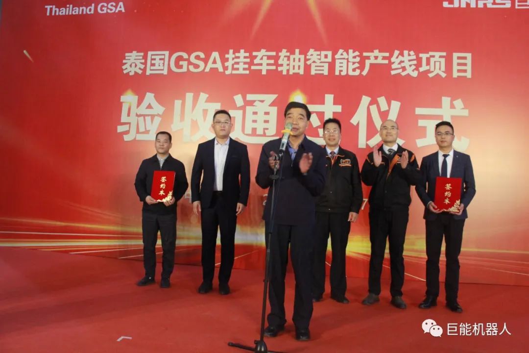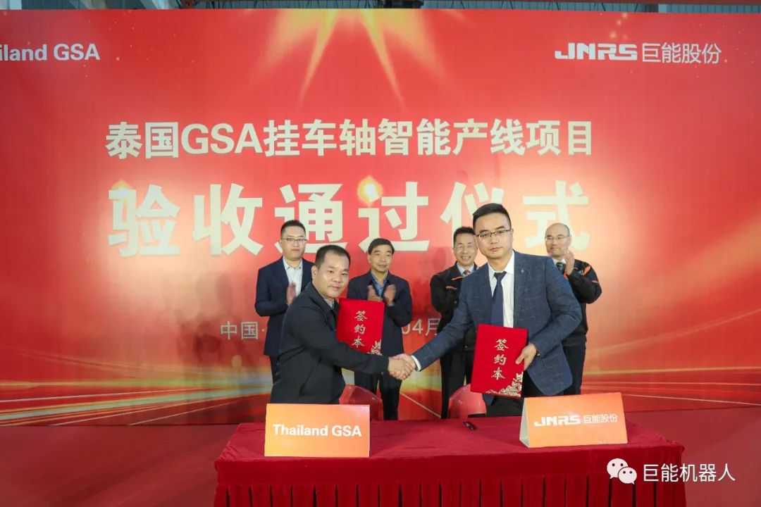 項(xiàng)目的預(yù)驗(yàn)收通過,充分展現(xiàn)了巨能公司對(duì)于大型復(fù)雜項(xiàng)目的管理和交付能力,再次印證巨能公司是一家制造“智能工廠”的工廠。隨后,該產(chǎn)線將正式裝船出?!俺黾蕖钡教﹪?guó)進(jìn)行安裝調(diào)試,巨能機(jī)器人產(chǎn)品將代表中國(guó)“智造”整體交鑰匙解決方案走向海外。預(yù)祝泰國(guó)GSA項(xiàng)目早日順利投產(chǎn)!