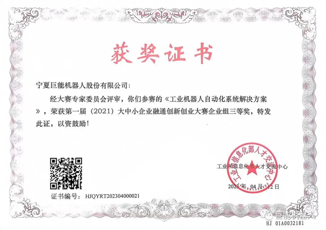 4月12日,由工信部人才交流中心、黑龍江省工信廳主辦的第一屆大中小企業(yè)融通創(chuàng)新創(chuàng)業(yè)大賽決賽暨頒獎(jiǎng)儀式在哈爾濱舉行。大賽吸引了來(lái)自浙江、天津、重慶、寧夏等全國(guó)多地企業(yè)和團(tuán)隊(duì)報(bào)名參賽,其中通過(guò)審核項(xiàng)目達(dá)到260個(gè),最終40個(gè)項(xiàng)目入圍總決賽,經(jīng)專(zhuān)家評(píng)委現(xiàn)場(chǎng)評(píng)選,由巨能股份報(bào)送的《工業(yè)機(jī)器人自動(dòng)化系統(tǒng)解決方案》,榮獲企業(yè)組三等獎(jiǎng)。